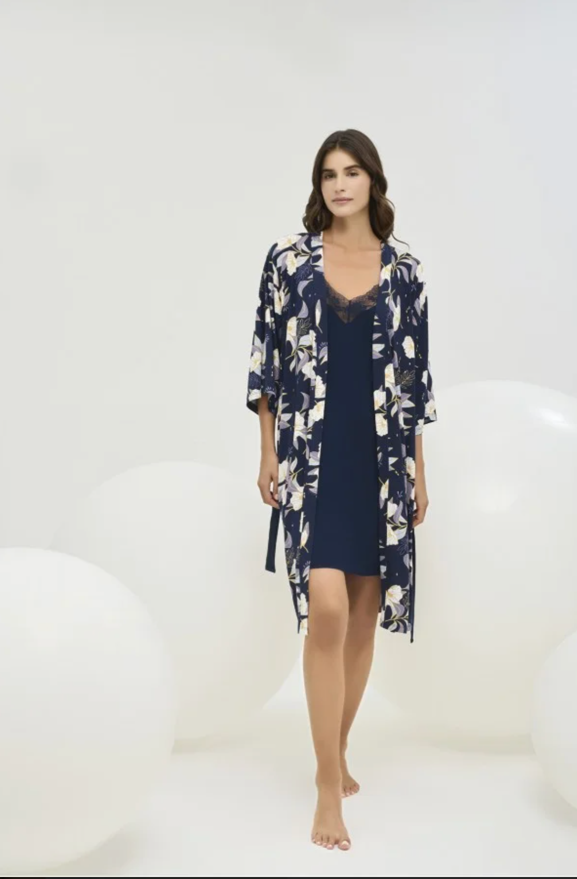 Dieses stilvolle 2-teilige Set besteht aus einem femininen Nachthemd mit feiner Spitze und einem passenden Morgenmantel mit floralem Muster. Perfekt für entspannte Abende zu Hause und erholsame Nächte.