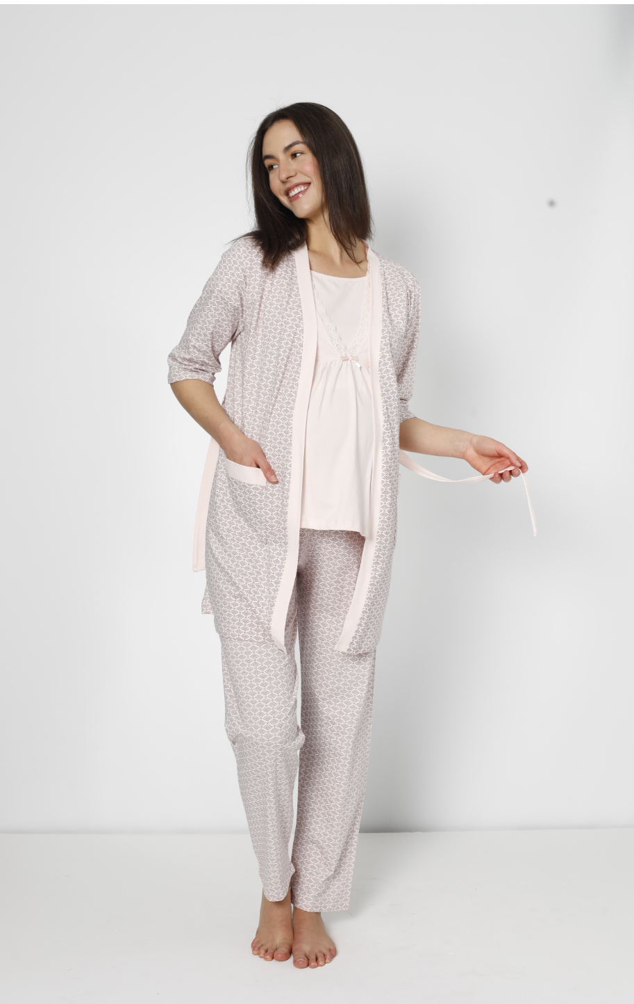 Dieser elegante 3-teilige Umstands- und Stillpyjama besteht aus einem weichen Oberteil mit Stillfunktion, einer bequemen Hose und einem passenden Morgenmantel.