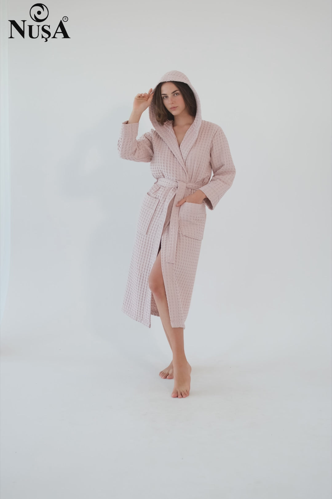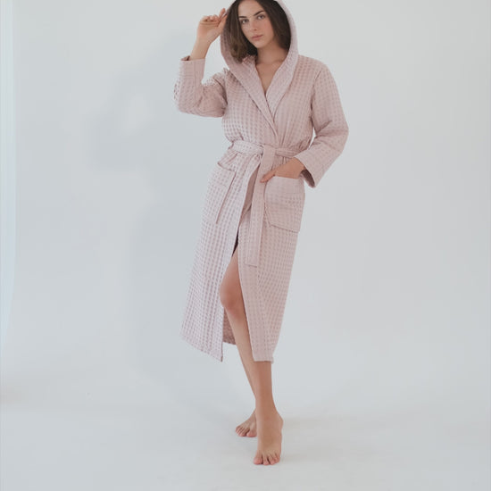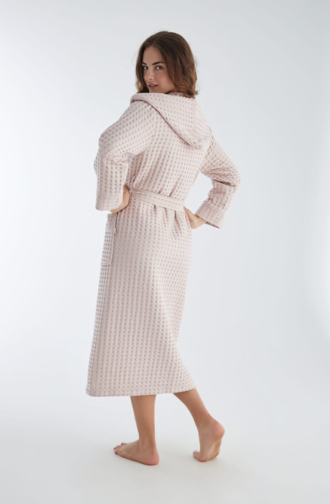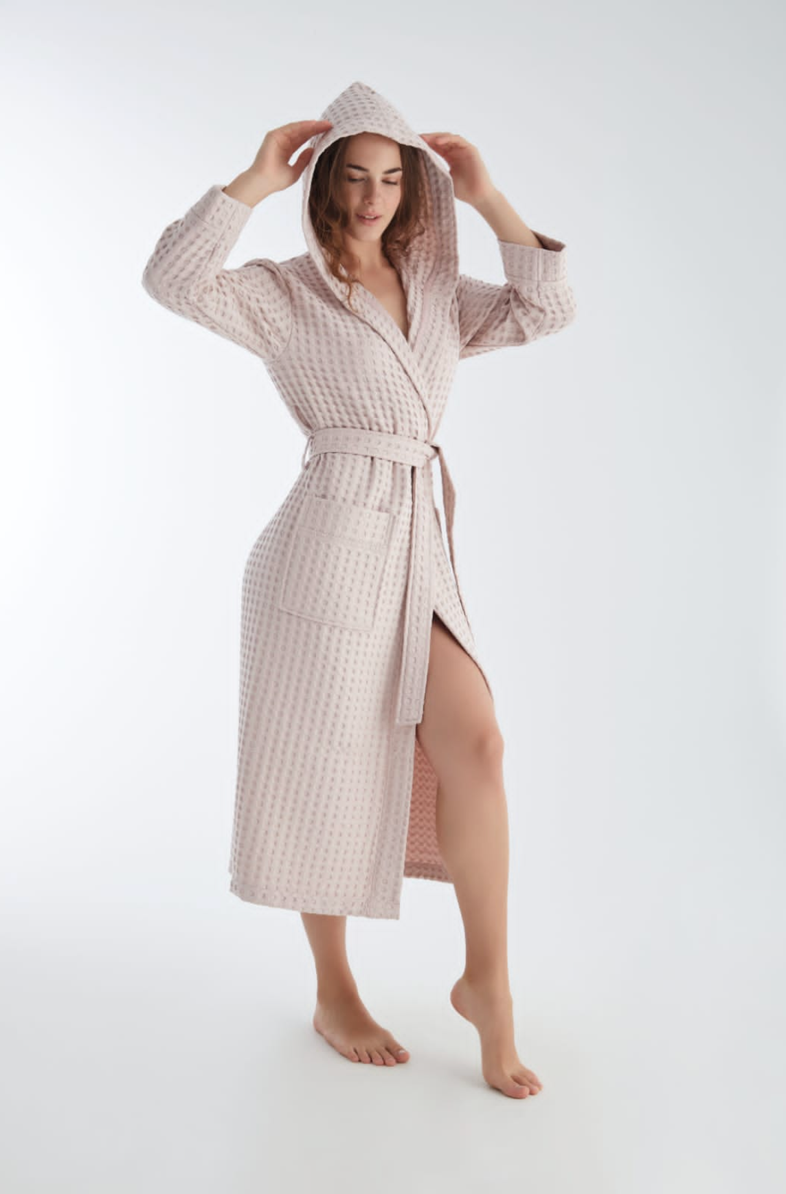 Eleganter Waffel Damen-Bademantel mit Kapuze und Gürtel