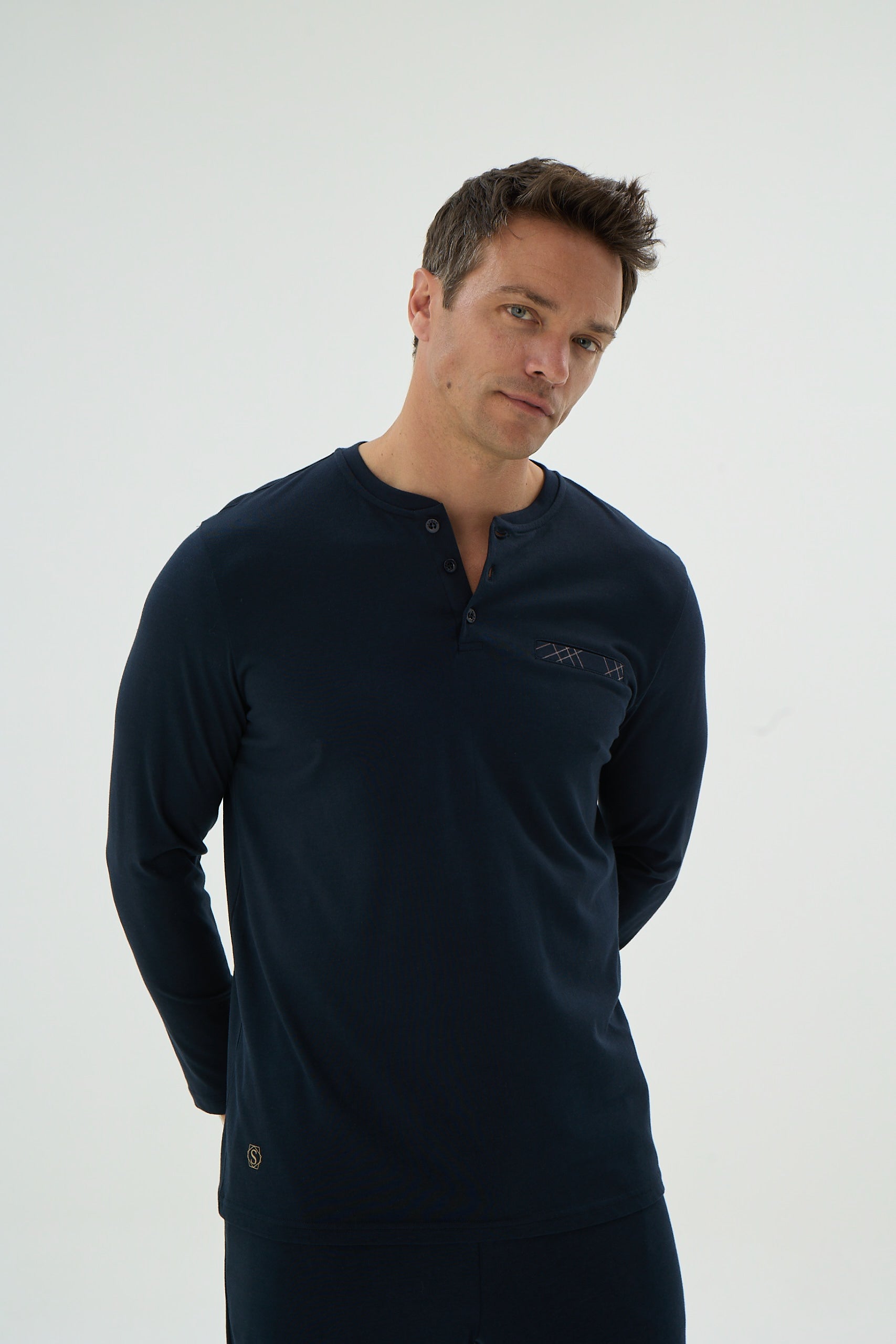 Das klassische Langarm-Shirt mit Knopfleiste sorgt für eine elegante Optik, während die bequeme Hose mit elastischem Bund Bewegungsfreiheit und höchsten Komfort bietet.