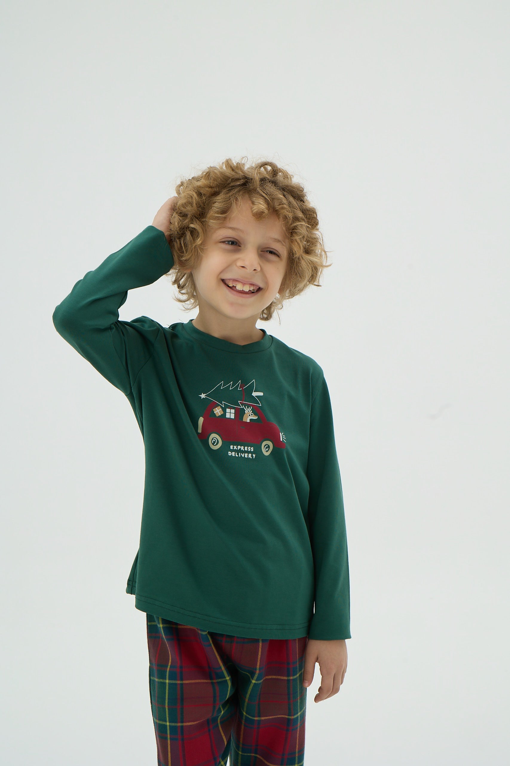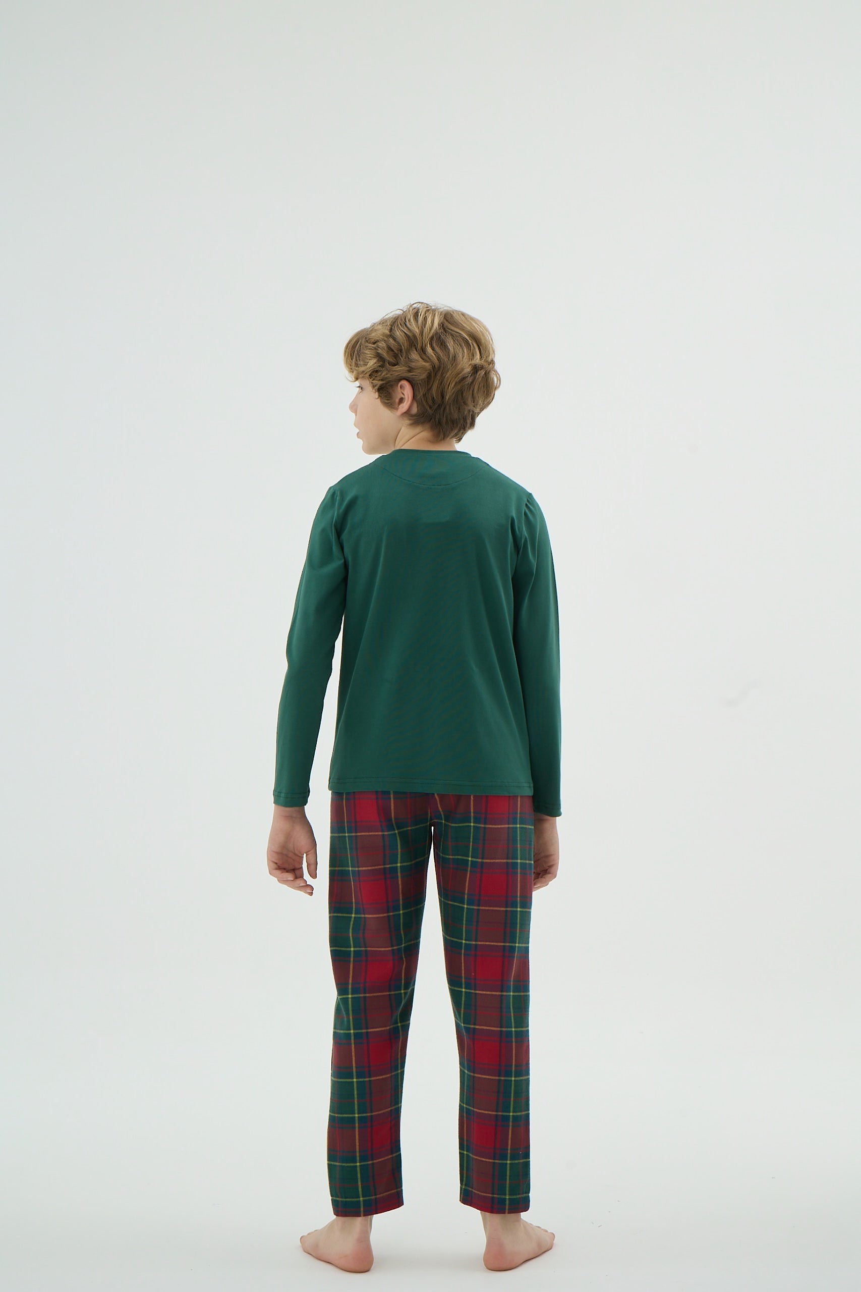 Kinder Weihnachts Pyjama-Set – Grünes Langarmshirt & Karohose