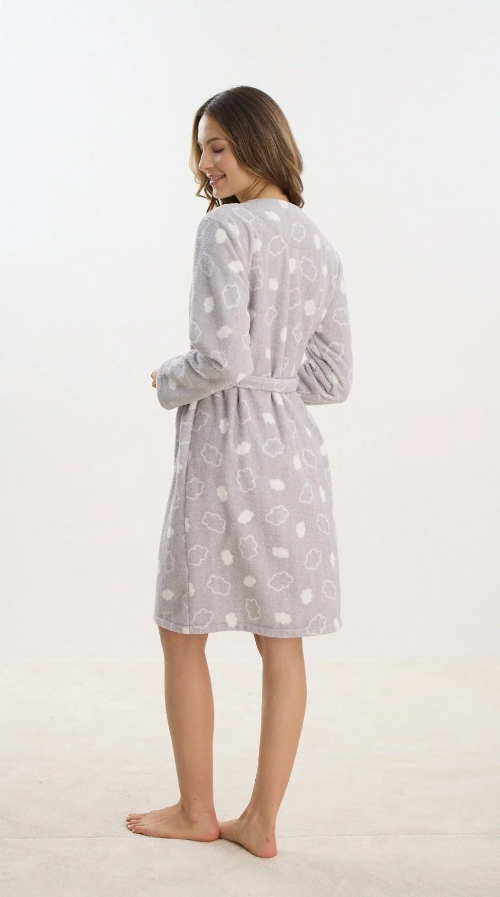 Mit seinem grauen Farbton und weißen Wolkenmustern verleiht der Bademantel ein modernes und gleichzeitig gemütliches Design. Der praktische Bindegürtel ermöglicht eine individuelle Passform und die große Tasche macht ihn nicht nur süß, sondern auch praktisch.